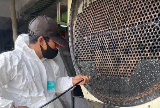 ระบบ Evaporative Condenser โรงงานอาหาร ภาพก่อนใช้สารเคมีป้องกันตะกรัน ท่อมีปริมาณตะกรันเกาะทั่วทั้งท่อ